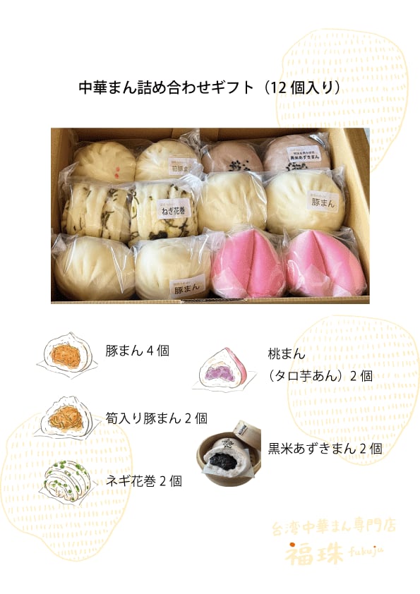 ●内容:豚まん4個、筍入り豚まん2個、ネギ花巻2個、桃まん(タロ芋餡)2個、黒米あずきまん2個 計12個入り